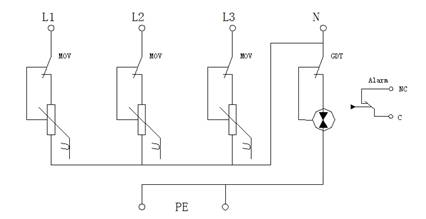 DXH06-FC621/3+1交流電源電涌保護(hù)器用于交流電源的第二級(C級)雷電過電壓保護(hù),采用3+1防護(hù)電路,如下列圖形所示。
