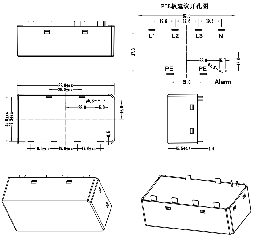 該電涌保護(hù)器采用PCB焊接安裝,PCB板鉆孔如上圖(PCB鉆孔圖)所示:焊接:產(chǎn)品可使用手工焊接或使用波峰焊焊接:手工焊接時建議使用恒溫烙鐵,溫度設(shè)置400℃±5℃,焊接時間1~3秒,焊錫絲建議使用常溫焊錫絲;推薦的波峰焊接曲線:預(yù)熱溫度1區(qū):115±5℃;2區(qū):155±5℃;峰值溫度265±5℃;鏈速:1.15~1.25m/min;具體要根據(jù)線路板的不同進(jìn)行調(diào)整。
