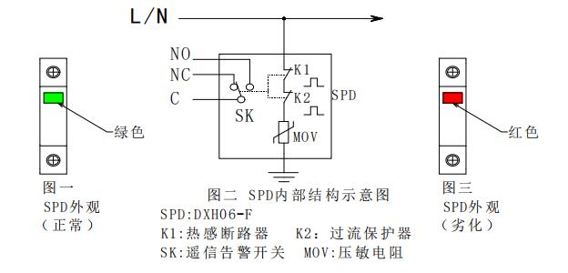 2 浪涌保護(hù)器正常工作時(shí),告警干接點(diǎn)為導(dǎo)通狀態(tài);浪涌保護(hù)器失效時(shí),狀態(tài)指示變紅色,同時(shí)告警干接點(diǎn)為開路狀態(tài)。