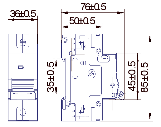 產品采用 35mm 標準導軌安裝,單模尺寸為:76×85×36(mm),未標注公差:±0.5mm。如下列圖所示(單位:mm):